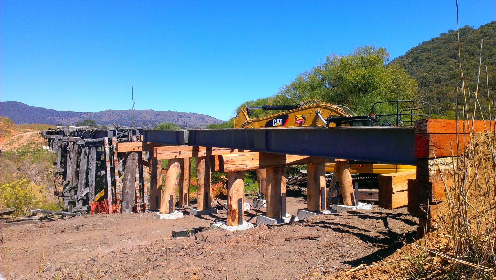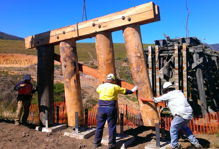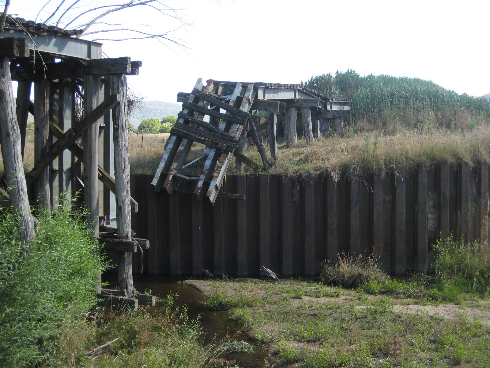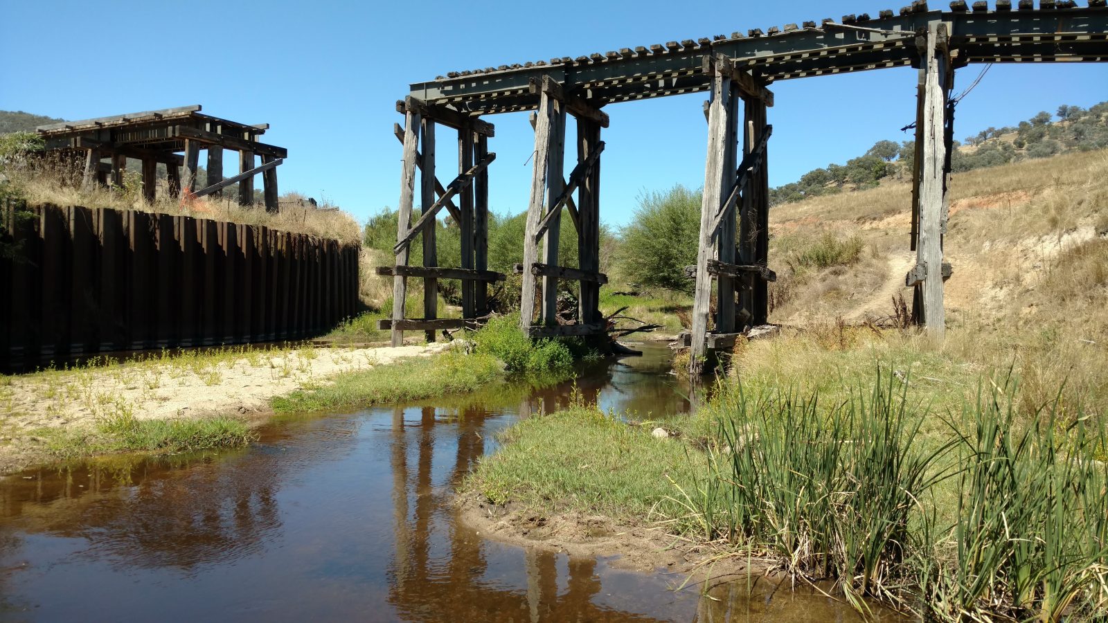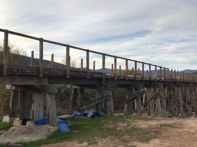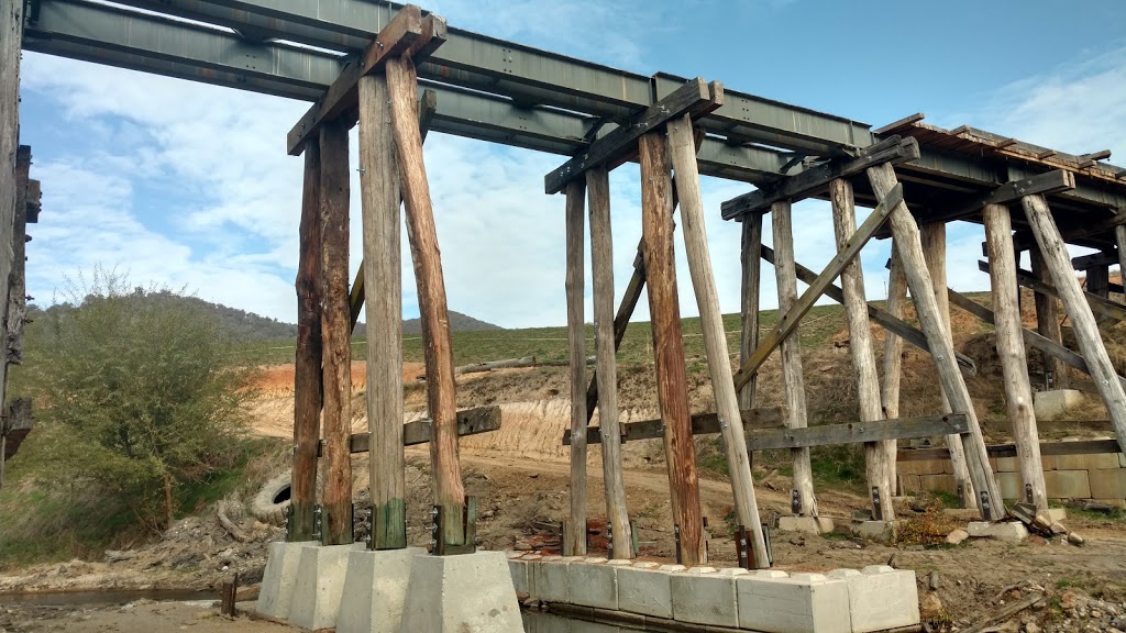 The 67 m long bridge at Dry Forest Creek, Bullioh survived the January 2026 bushfire. It was restored between 2015 and 2019 after deteriorating since the closure of the line. It was affected by white-ants, and damaged by willow growth and flood debris. Two girder and pylon sections had completely collapsed. The reconstruction used parts of the original bridge steel plus blue gum posts and redgum decking. The pier and cross-head trestles were put together and braced individually on the ground, then lifted into position and bolted onto new concrete footings. The restoration work was completed by the Tallangatta Rail Trail Advisory Group together with Parklands Rangers, volunteers, neighbours, and contractors. The opening of the bridge was a huge milestone after years of hard work!
