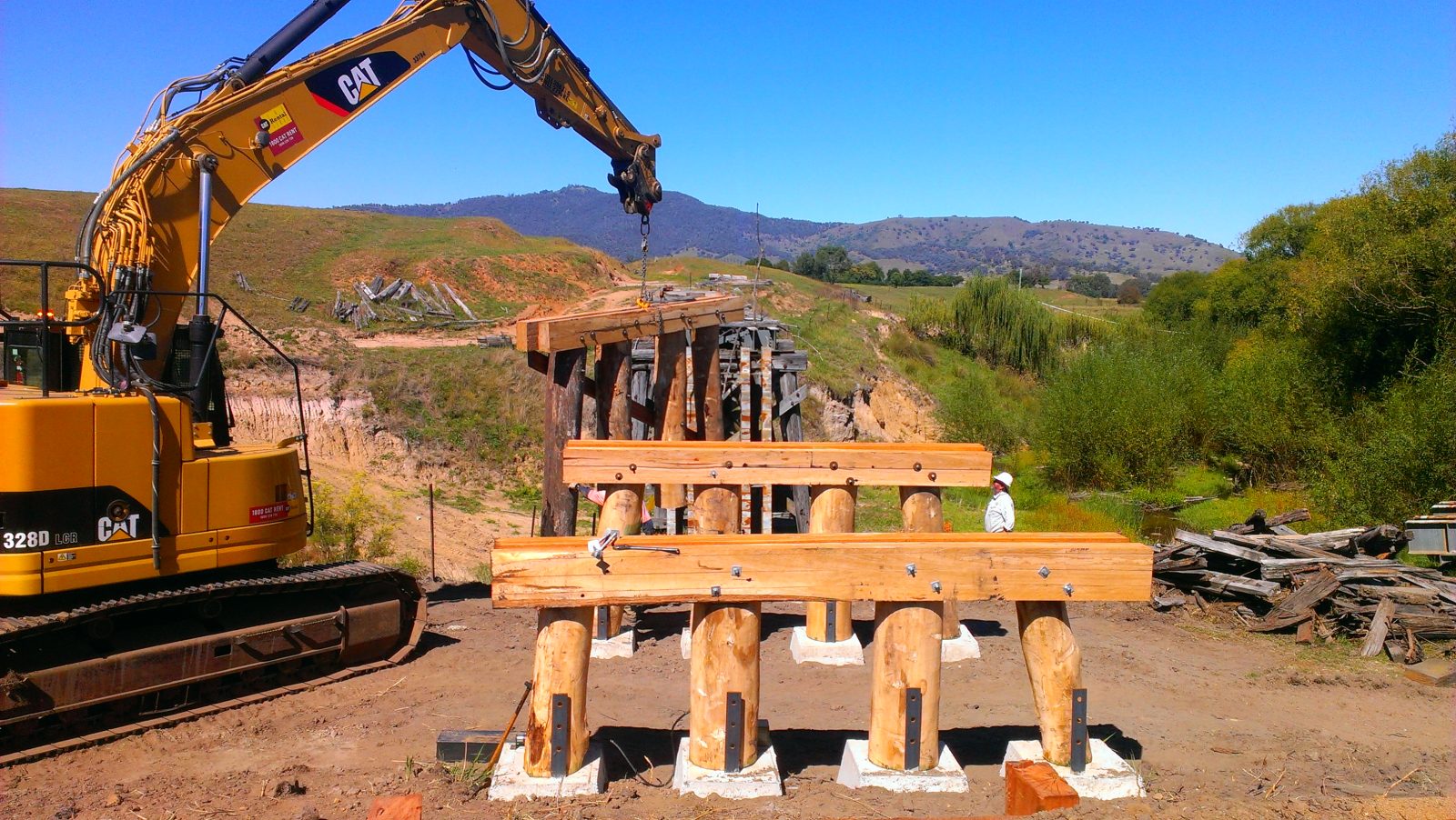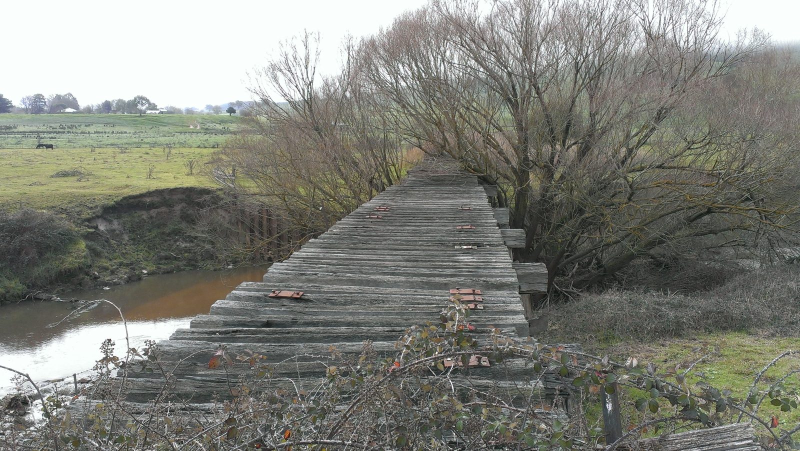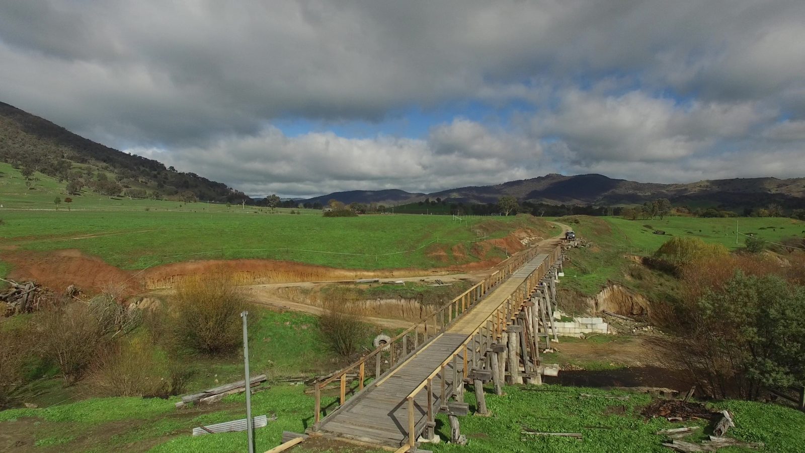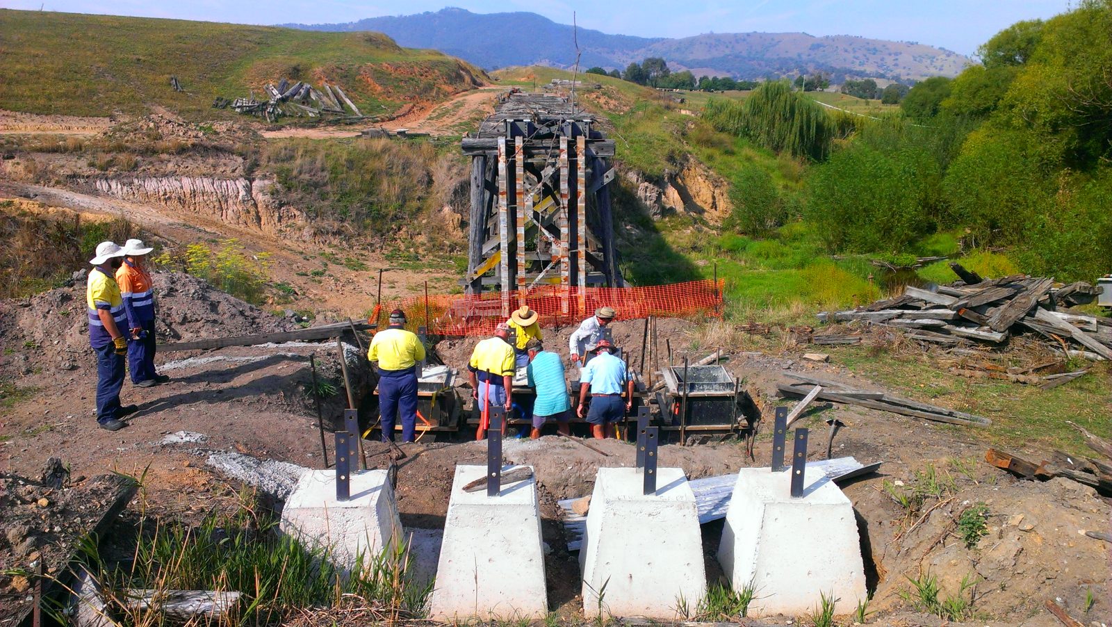 The 67 m long bridge at Dry Forest Creek, Bullioh survived the January 2026 bushfire. It was restored between 2015 and 2019 after deteriorating since the closure of the line. It was affected by white-ants, and damaged by willow growth and flood debris. Two girder and pylon sections had completely collapsed. The reconstruction used parts of the original bridge steel plus blue gum posts and redgum decking. The pier and cross-head trestles were put together and braced individually on the ground, then lifted into position and bolted onto new concrete footings. The restoration work was completed by the Tallangatta Rail Trail Advisory Group together with Parklands Rangers, volunteers, neighbours, and contractors. The opening of the bridge was a huge milestone after years of hard work!