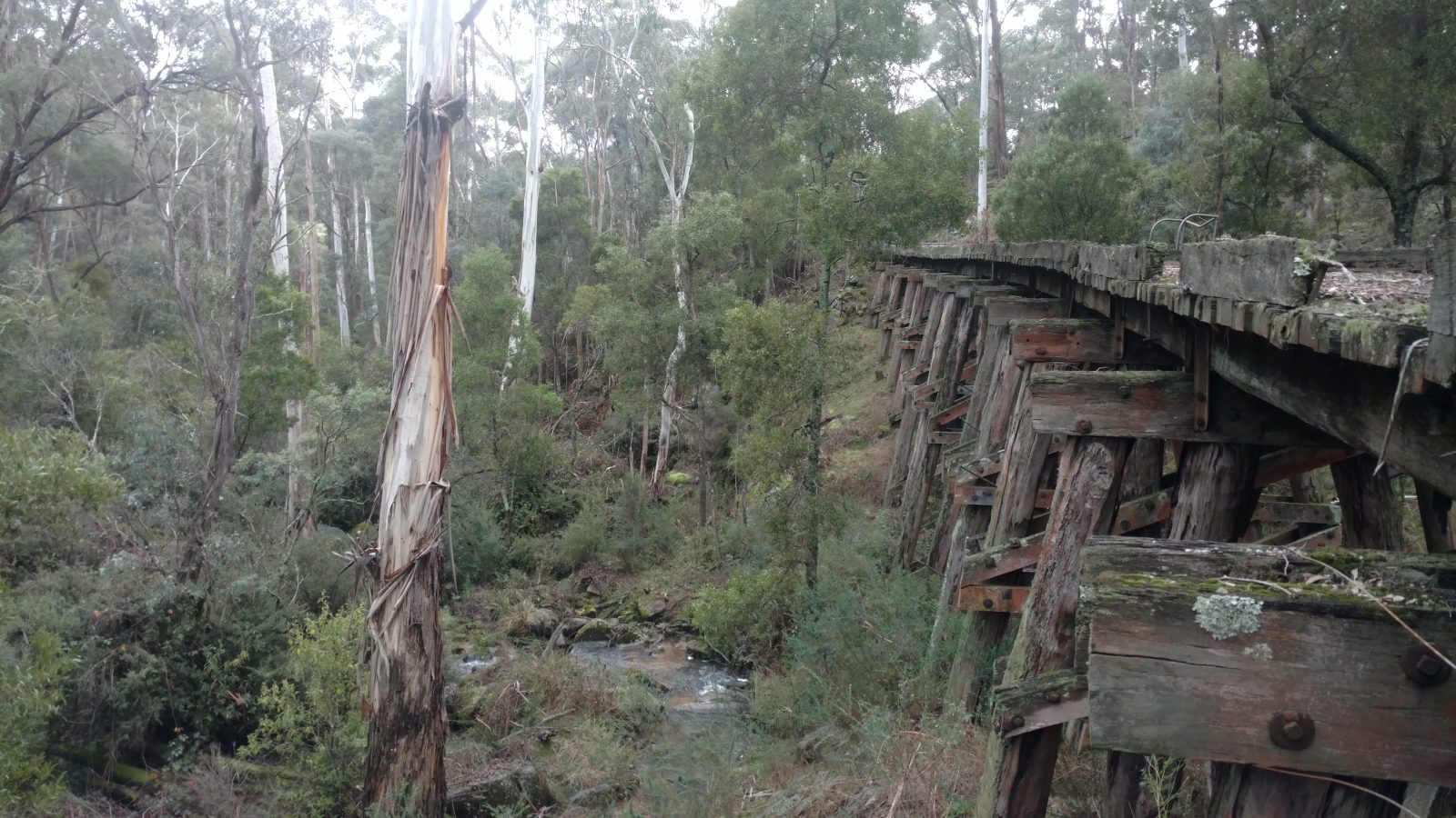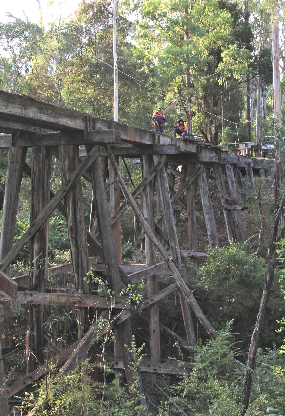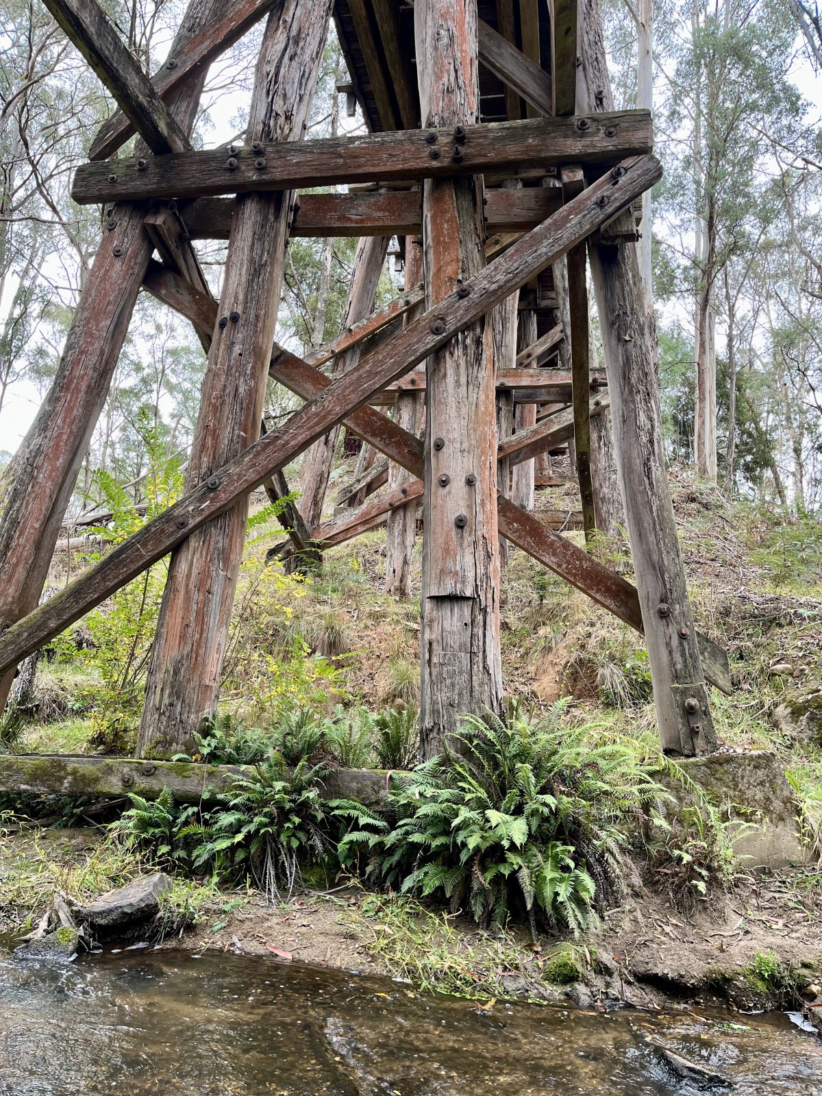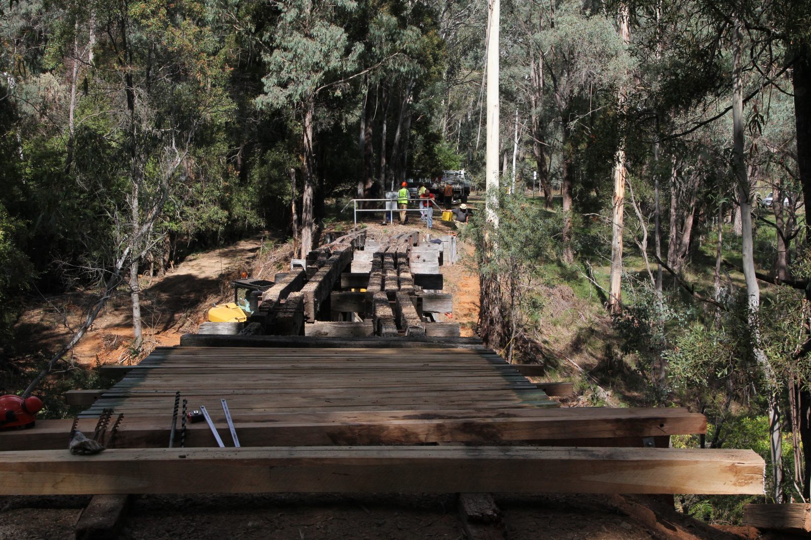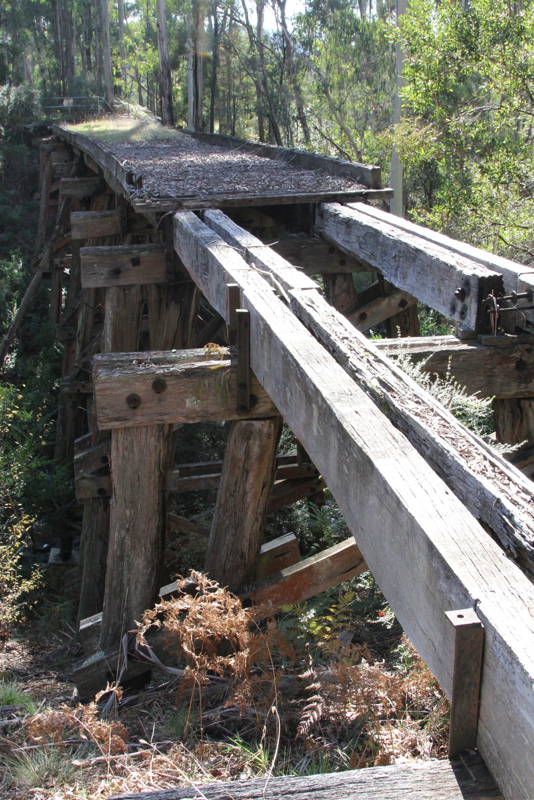 The trestle bridge at Koetong Creek, Koetong was lost in the January 2026 Upper Murray bushfire. The original bridge was 47 m long and 11.2 m tall, consisting of nine timber spans. The bridge was restored in 2013 after initial assessments indicated that some of the pylons, cross beams, and bearers had deteriorated and needed replacing. Firstly, the unsafe decking was removed so work could begin. The Army Reserve Construction Regiment felled and milled the timber required and a number of upright pylons were cut and new sections added. New decking was then installed along with handrails. Works were carried out by members of the Tallangatta Rail Trail Advisory Group, community volunteers, and Parklands Rangers.