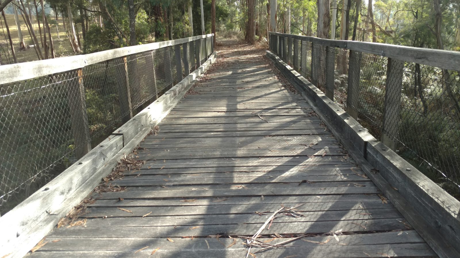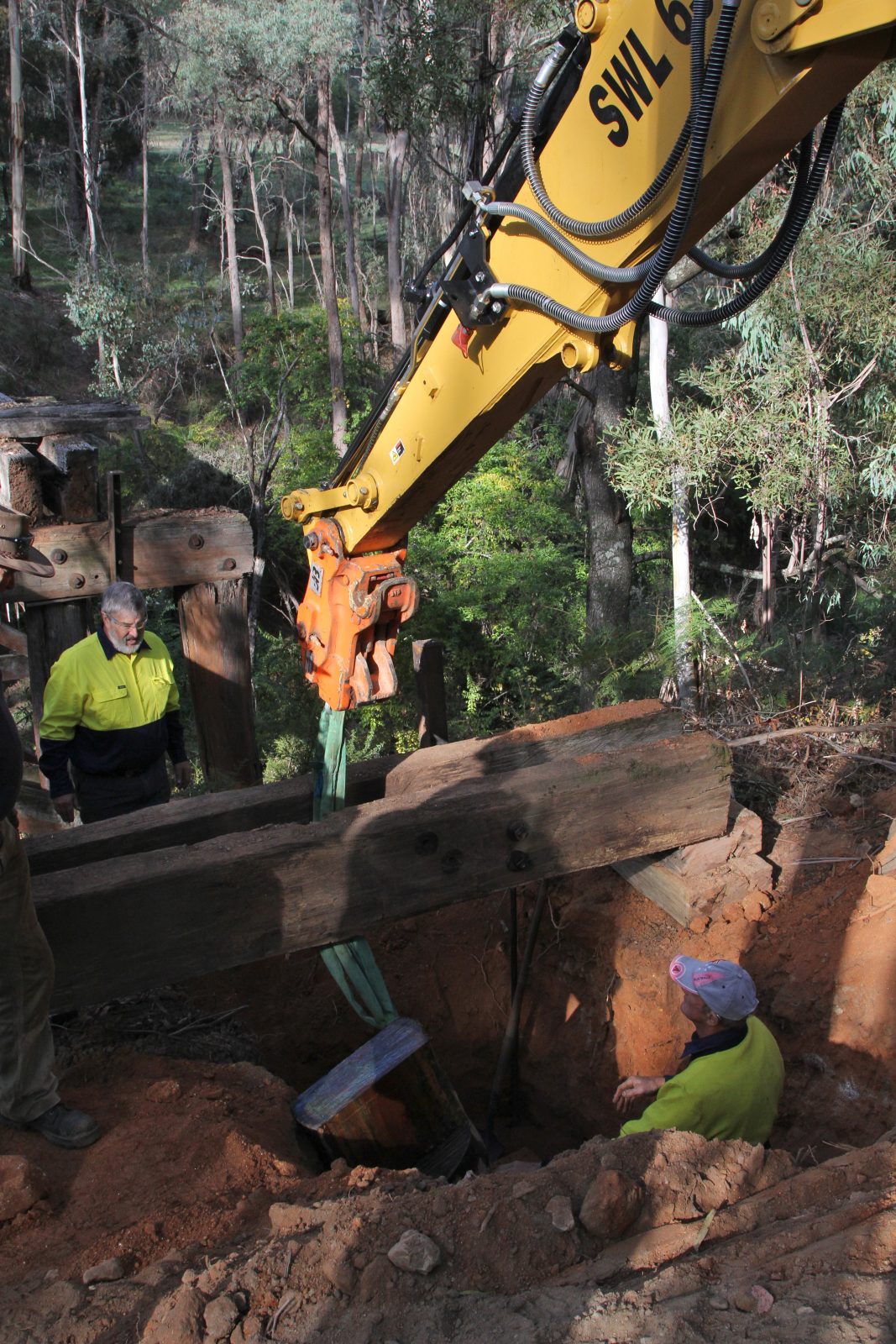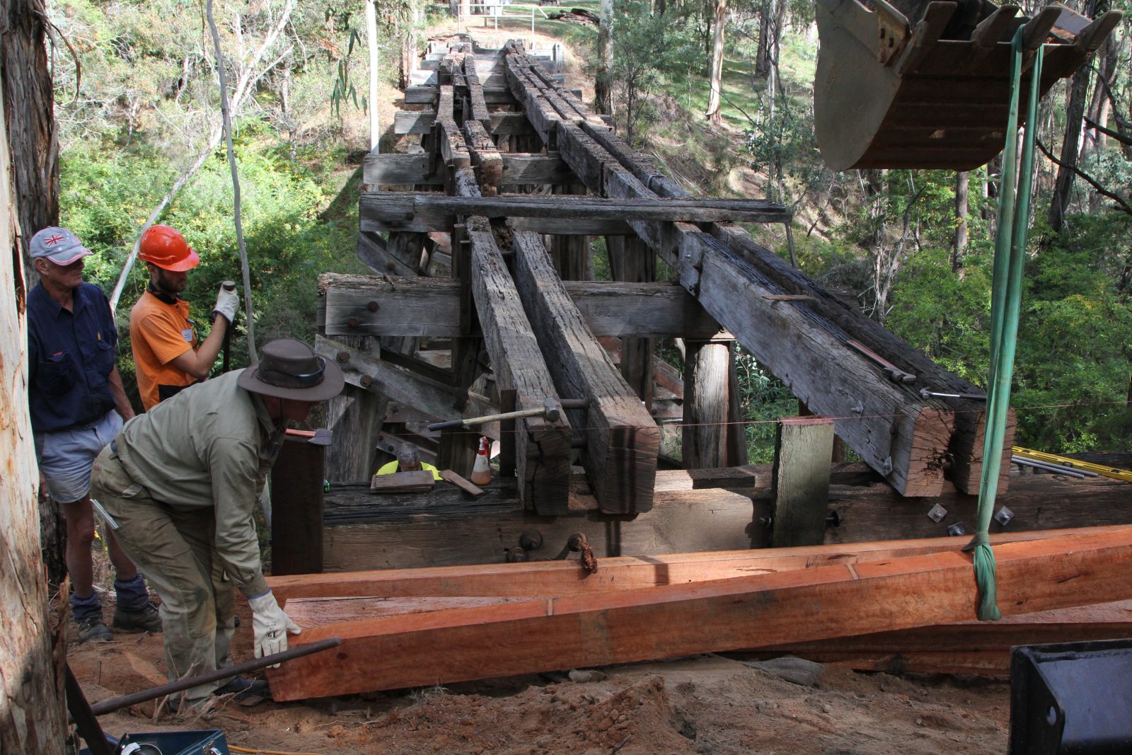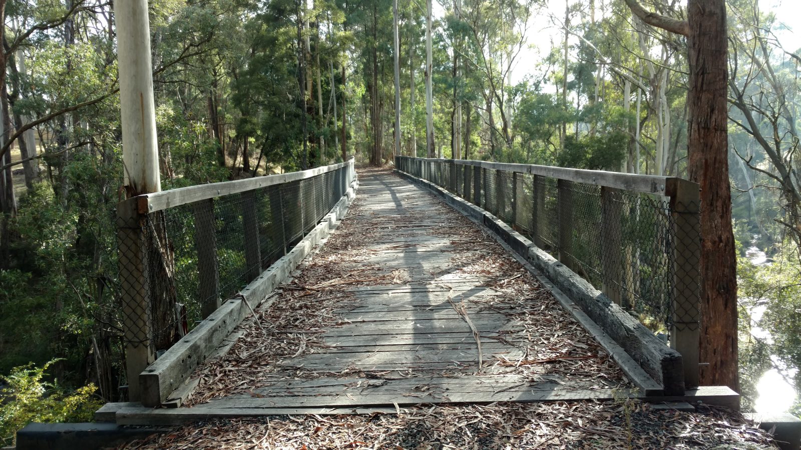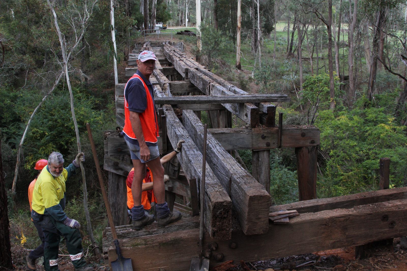 The trestle bridge at Koetong Creek, Koetong was lost in the January 2026 Upper Murray bushfire. The original bridge was 47 m long and 11.2 m tall, consisting of nine timber spans. The bridge was restored in 2013 after initial assessments indicated that some of the pylons, cross beams, and bearers had deteriorated and needed replacing. Firstly, the unsafe decking was removed so work could begin. The Army Reserve Construction Regiment felled and milled the timber required and a number of upright pylons were cut and new sections added. New decking was then installed along with handrails. Works were carried out by members of the Tallangatta Rail Trail Advisory Group, community volunteers, and Parklands Rangers.